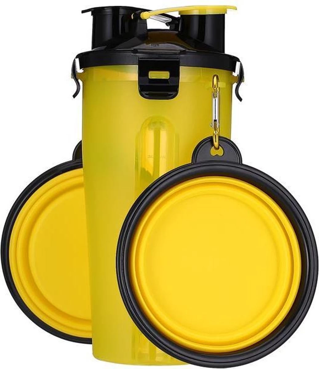 2 in 1 voer en drinkfles voor huisdieren incl. opvouwbare siliconen bakken (2 x 350ml) + 2x karabijnhaak.