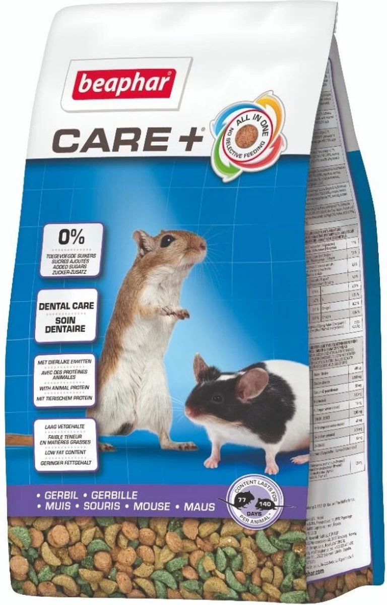 Care+ Gerbil is een zeer smaakvolle super premium voeding. Het is ontwikkeld in samenwerking met dierenartsen en voedingsdeskundigen. Care+ is een geΓ«xtrudeerd, deze hittebehandeling maakt een betere vertering van eiwitten uit het voer mogelijk. De ingrediΓ«nten zijn afgestemd op de voedingsbehoefte en benaderen het natuurlijke voedingspatroon. Ieder brokje heeft dezelfde samenstelling (All-in-One), met als resultaat: geen selectief eetgedrag, dus geen restjes en geen tekort aan essentiΓ«le voedingsstoffen. De harde brokjes ondersteunen de natuurlijke slijtage van de tanden (Dental Function). De brokjes bevatten verder een uitgebelanceerde verhouding van de meervoudig onverzadigde vetzuren Omega 3 & Omega 6 (uit maΓ―s, tarwe, soja en vlaszaad), met vitamine E voor de lichaamscellen, met dierlijke eiwitten en smakelijke kruiden. Met Care+ heeft u absoluut het beste voor uw gerbil in handen.