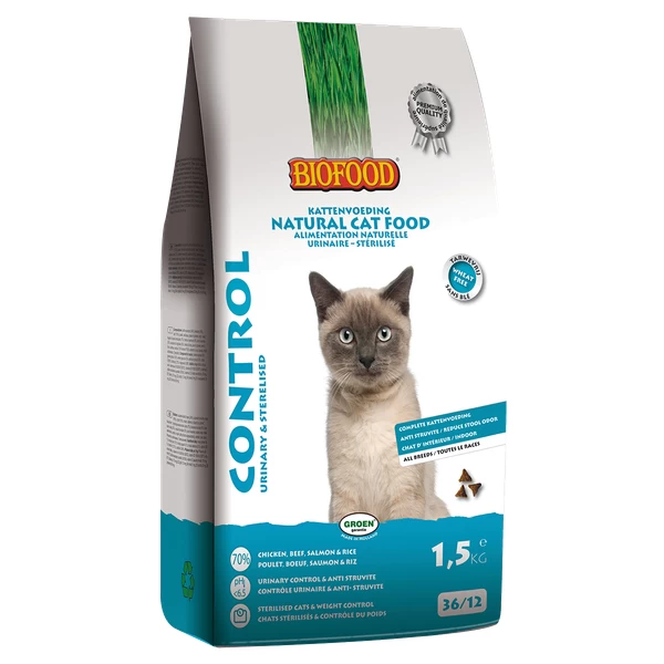 De Biofood Control Urinary & Sterilised is van Nederlandse topkwaliteit. Een voeding rijk aan kip, rund en zalm, aangevuld met rijst, prebiotica, FOS (inuline), zalmolie met omega 3 en 6 vetzuren en taurine. Een licht verteerbare voeding met een hoge acceptatie. Verpakt in een duurzame, unieke en exclusieve 'No waste' verpakking die 100% recyclebaar is.