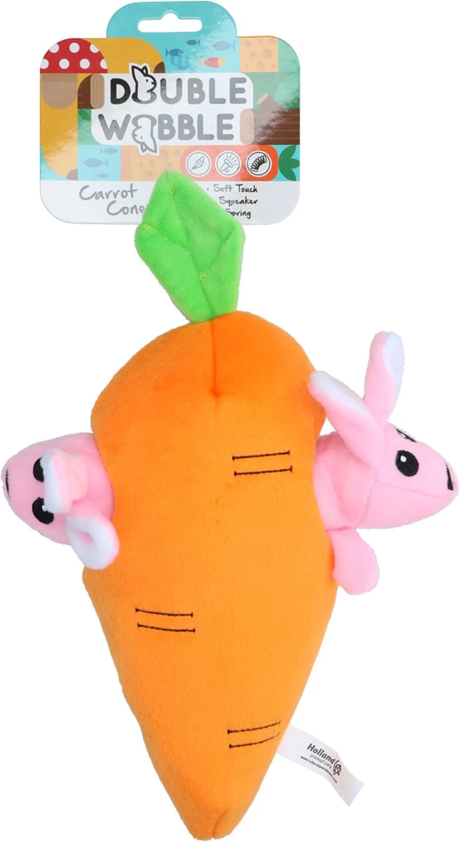 De Double Wobble Carrot Conejos zijn twee roze konijntjes, die zich thuis voelen in de grote knuffel in de vorm van een wortel! Beide konijntjes zijn voorzien van een pieper en worden verbonden door middel van een zachte, maar toch sterke springveer. Bij speeltijd springen ze dus tevoorschijn, om trekspelletjes met je hond dubbel zo leuk te maken! De Double Wobble Carrot Conejos beschikken bovendien over vijf andere Double Wobble-maatjes!