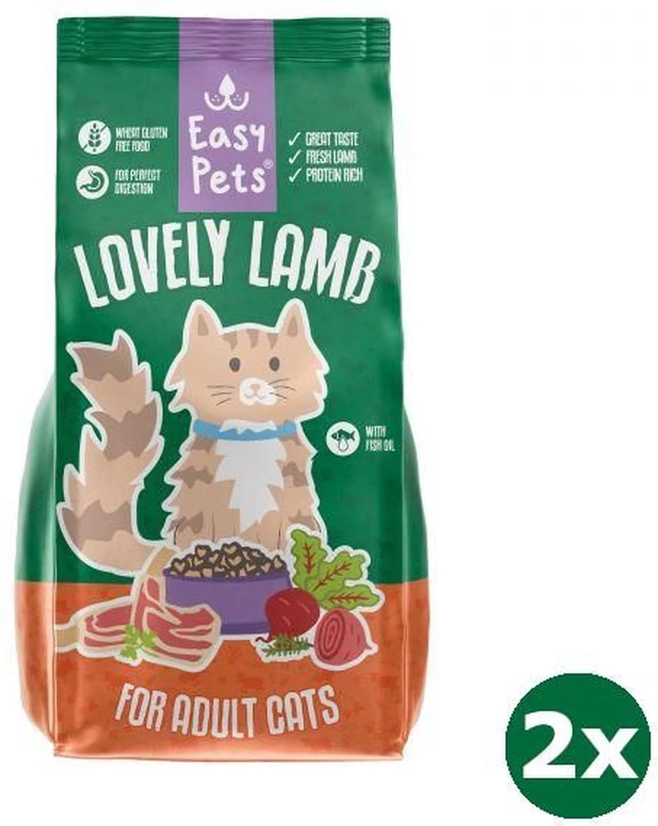 Easypets Lovely Lamb Adult Kattenvoer 300grSamenstelling: Lamsvlees (min. 10%), gedroogd kippenvlees, rijst (min. 20%), maΓ―s, maΓ―sgluten, gedroogd, dierlijk vet, bietenpulp, kippenleverextract, zalmolie, plantaardige vezels, taurine, vitamines, mineralen, sporenelementen.Bevat door de EG toegestane antioxidant: tocopherolen.Analytische bestanddelen: Ruw eiwit 31%, Ruw vet 18%, Ruwe celstof 2,5%, Ruwe as 7,1%, Vocht 10%, Koolhydraten 31,4%, Calcium 1,18%, Fosfor 0,91%, Natrium 0,31%, Magnesium 0,09%, Kalium 0,4%, Taurine 1500 mg/kg, Lysine 1,16%, 0,68%, Cystine 0,45%, Treonine 1,08%, Tryptophaan 0,22%, Linolzuur 2,15%, Linoleenzuur 0,12%, Energiewaarde 4116 Kcal/kgToevoegingen: Vitamine A IE/kg 16875, Vitamine D3 IE/kg 1650, Vitamine E IE/kg 250, Vitamine K3 mg/kg 0,8, Thiamine (B1) mg/kg 7,5, Riboflavine (B2) mg/kg 5,6, Niacine (B3) mg/kg 52,5, Panthotheenzuur (B5) mg