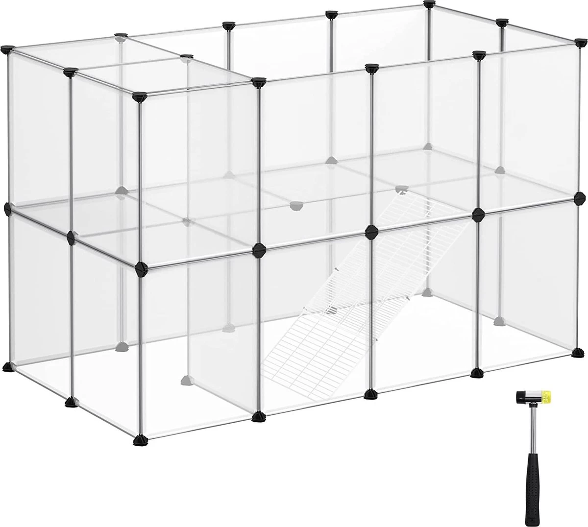 Leveringsomvang: alle benodigde kunststof platen, verbindingsstukken en kabelbinders, 12 anti-slip pads, 2 metalen roostertrappen met een rasterafstand van 1,3 cm en 1 rubberen hamer voor het in elkaar zetten van een speelbox voor je kleine huisdieren.