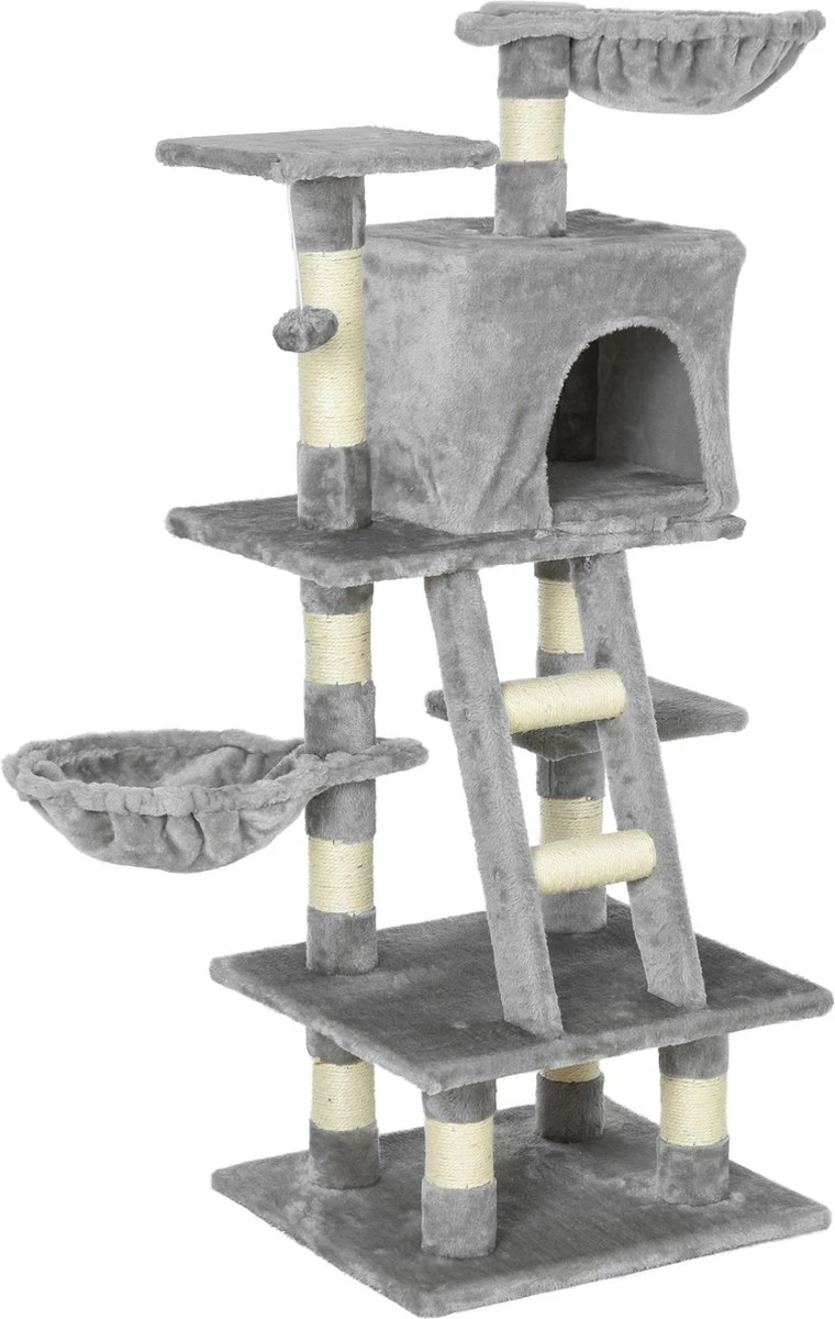 Bevredig op een veilige manier de natuurlijke instincten van je kat met deze krabpaal van PawHut! Zowel het dier als zijn baasje hebben voordeel bij de kattenkrabpaal, omdat het een plek is waar katten naar hartenlust kunnen krabben en klimmen, zodat je tapijt en meubels worden beschermd tegen beschadigingen. Rusten, spelen, oefenen, jouw katten kunnen hierop de hele dag bezig zijn; een comfortabel meubel voor je harige vrienden Eigenschappen: · Heeft verschillende hangende speeltjes aan de krabpaal om je kat te vermaken · Bedekt met zacht pluche je katten zullen dit heerlijk vinden · De manden en de ruime grot bieden je katten een comfortabele plek om te ontspannen · De sisalpalen bevredigen de krabbehoefte van je kat, zodat je meubels tegen krassen worden beschermd · De multi-activity krabpaal is gemaakt van hoogwaardig E1-kwaliteit spaanplaat · Eenvoudige montage vereist Technische gegevens: · Kleur: grijs · Materiaal: E1-kwaliteit spaanplaat, pluche, sisal · Totale afmetingen: 49 l x 44 b x 120 h cm · Afmetingen mand (2 stuks): Ø 30 cm · Afmetingen kattengrot: 35 l x 30 b x 28 h cm · Afmetingen trap: 17 b x 49 h cm · Afmetingen platforms (van onder naar boven): 49 l x 44 b cm, 49 l x 44 b cm, 25 l x 25 b cm, 49 l x 35 b cm, 25 l x 25 b cm · Afmetingen deuropening: 20 l x 18 h cm · Afmetingen palen: Ø 6,8 cm · Draagvermogen (totaal): 30 kg · Draagvermogen (kattengrot): 4,54 kg · Omvang van de levering: 1 x krabpaal · Verzendbriefje: Geen verzending naar Nederlandse eilanden.