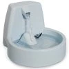 De PetSafe® Streamside Keramieken Drinkfontein is optimaal geschikt voor katten en kleine honden om hun dorst te lessen. Door de continu circulerende stroom van vers, gefilterd water worden je huisdieren aangespoord tot drinken. Zelfs schuwe huisdieren worden gelokt door het rustig stromende water. Dankzij de twee soorten filters blijft de pomp vrij van haar en speeksel. Zo blijft het water dus steeds schoon en smaakneutraal. PetSafe® Streamside Keramische Drinkfontein in één oogopslag: Mooie drinkfontein voor katten en kleine honden Stimuleert drinken: het rustig klaterende water zet aan tot vochtopname Stille waterstroom: weinig geluid, ideaal voor schuwe en snel geschrokken dieren Hygiënisch materiaal: BPA-vrij en krasbestendig, toren en schaal vaatwasmachinebestendig Constante waterstroom: vermindert de groei van bacteriën, houdt het water koel 2 filters: beschermen de pomp tegen haar vuil, houden het water schoon smaakneutraal Compact formaat: slank, elegant ontwerp ook geschikt voor kleine ruimtes Draagt bij aan een beter woonklimaat Garantie: 1 jaar Volume: 1,8 l Afmetingen: Drinkfontein: L 30,48 x B 30,02 x H 18,8 cm. Actiefkoolstoffilter: L 10,01 x B 6,5 x H 7,49 cm. Schuimfilter: L 8,79 x B 6,5 x H 10,8 cm. Materiaal: keramiek Kleur: grijs Filter: actifkoolstoffilter schuimfilter Levering: PetSafe® Keramieken Drinkfontein Streamside, verwisselbaar actiefkoolstoffilter, verwisselbaar schuimfilter, korte gebruiksaanwijzing Fontein schoonmaken Reinig de fontein een keer per week met een zachte spons en milde zeep en spoel zorgvuldig af. Zorg ervoor dat er geen zeepresten achterblijven. Let er bovendien op dat er voldoende water in de fontein zit. De pomp mag nooit drooglopen. Filter schoonmaken Neem het filter uit de bodem en spoel het af. Was het filter niet met zeep. Vervang het filter als het ernstig verontreinigd is of andere vreemde stoffen bevat en vervang het (vervangfilters afzonderlijk verkrijgbaar). Vervang het filter iedere drie tot vier weken of zodra er tekenen van verzadiging met vreemde stoffen (onzuiverheden, voedselresten, haren, etc.) opvallen. Een regelmatigere vervanging kan noodzakelijk zijn afhankelijk van de woonomgeving of waterkwaliteit, alsmede bij gebruik door meerdere dieren. Lees hiervoor de gebruiksaanwijzing. Pomp schoonmaken Controleer de aandrijfmagneet (“propeller”, “impeller”) door deze van de pomp te verwijderen en zorgvuldig met een doek te reinigen. Aangezien leidingwater kalk bevat, verkalkt na een aantal maanden niet alleen je koffiezetapparaat, maar ook het filter van aquariums en drinkfonteinen voor katten en honden. Het is daarom goed om de aandrijfmagneet niet alleen schoon te maken, maar ook af te nemen met azijn. De aandrijfmagneet ziet er uit als een propellor/rotor. Zet een schoteltje met azijn klaar. Verdun de azijn met wat leidingwater en dep een doek in het mengsel. Met de vochtige doek veeg je de aandrijfmagneet en omgeving voorzichtig schoon. Het is zeer belangrijk dat alle onderdelen na reiniging nog eens zeer grondig met leidingwater worden afgespoeld. Azijn en andere schoonmaakmiddelen zijn namelijk schadelijk voor dieren. Reinig de pomp ten minste om de vier weken. Lees hiervoor de gebruiksaanwijzing.