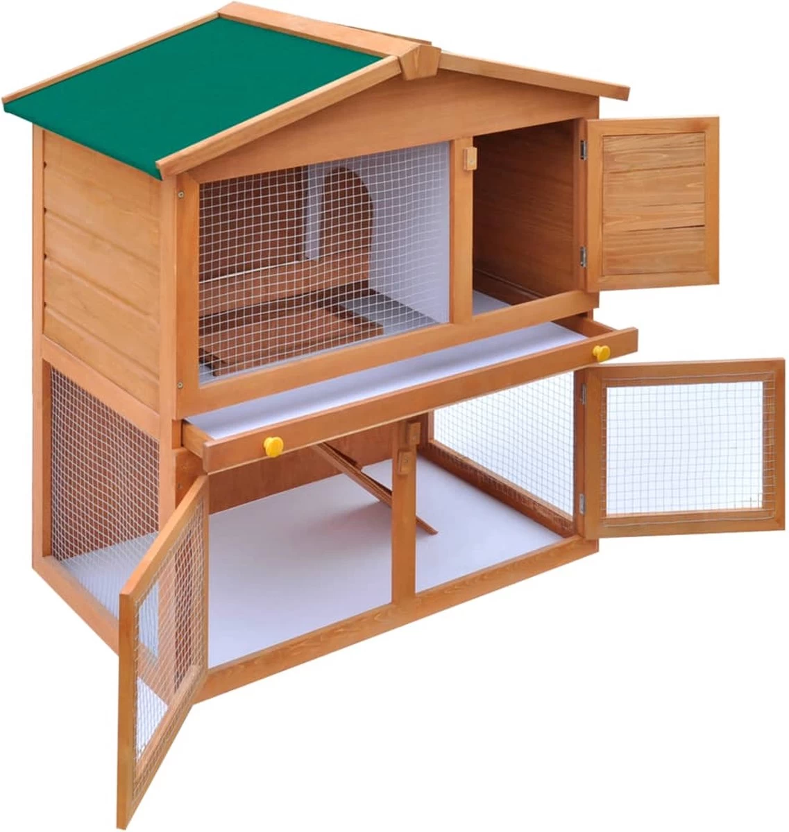 Dit konijnenhok heeft een hoogwaardig houten frame waardoor het een sterke en veilige omheining wordt die jarenlang meegaat. Het groene dak houdt regen weg terwijl het knusse nachthok het perfecte slaapvertrek vormt. Een makkelijk te beklimmen helling loopt van de onderste naar de bovenste verdieping. De deuren kunnen dankzij de schuifgrendels eenvoudig vergrendeld worden.